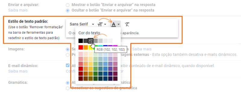 3. Na aba Geral que se abre, role a tela um pouco para baixo, até a opção Estilo do texto padrão. Selecione a cor padrão com a 3ª variação de cinza (RGB 102 102 102).
