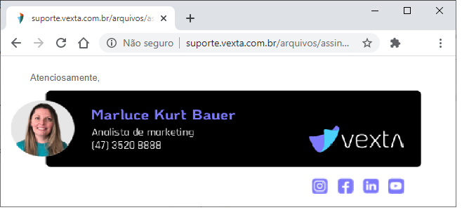 1. Abra o navegador e informe o endereço http://suporte.vexta.com.br/arquivos/assinaturas/?[seu endereço de e-mail]. Por exemplo: http://suporte.vexta.com.br/arquivos/assinaturas/?marluce.bauer@vexta.com.br.