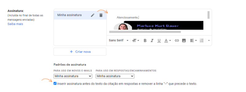 Além disso marque a caixa Inserir assinatura antes do texto da citação em respostas e remover a linha "--" que precede o texto.