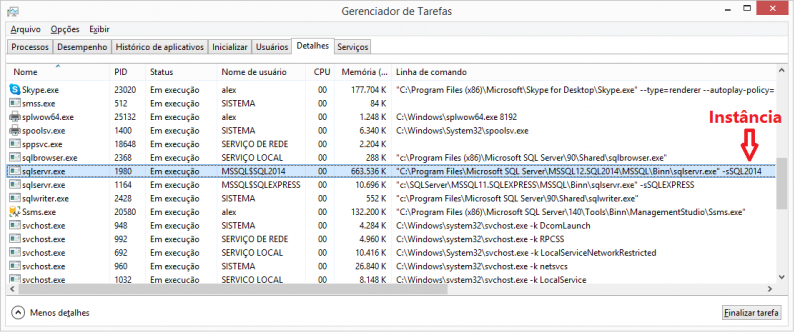 * O parâmetro -s somente é necessário se tiver uma instância nomeada. Se for instância padrão, suprimir este parâmetro. * Você pode verificar a pasta BINN do servidor e o nome da instancia, exibindo a coluna "Linha de comando" da aba "Detalhes" do gerenciador de tarefas: