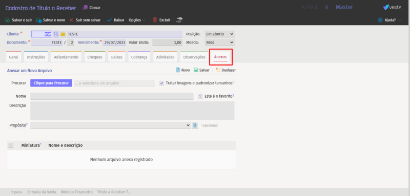 No cadastro do título, você encontrará a nova aba "Anexos". Nessa aba, você poderá anexar arquivos relevantes ao título, como documentos ou imagens.