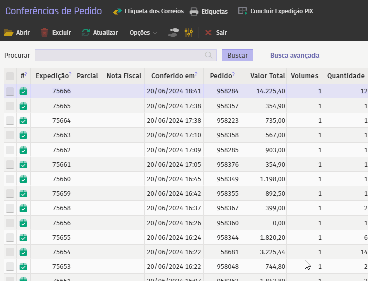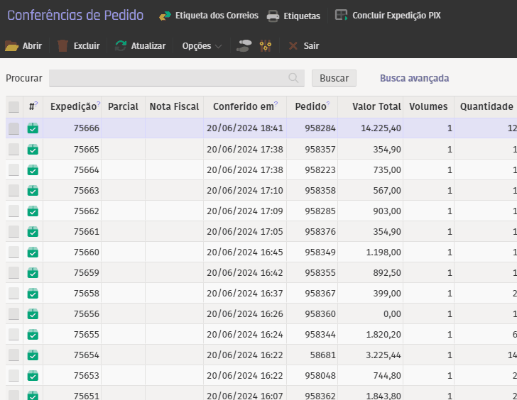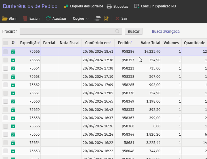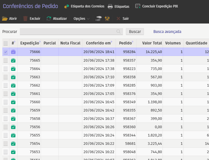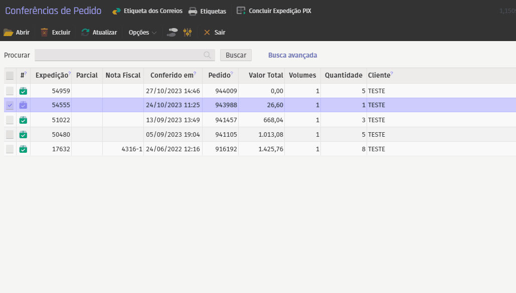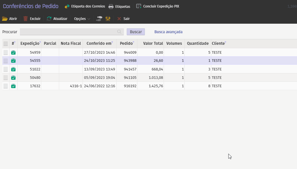 Para preencher uma etiqueta, selecione a expedição desejada e complete os detalhes nas abas fornecidas.