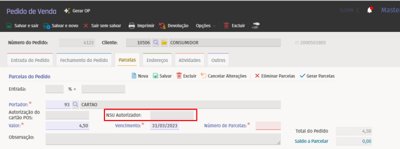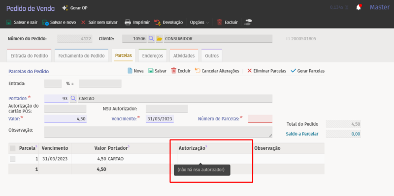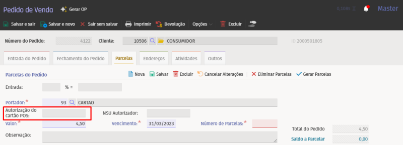 Após isso, selecionando esse portador no pedido de venda, o campo Autorização do cartão POS será exibido.