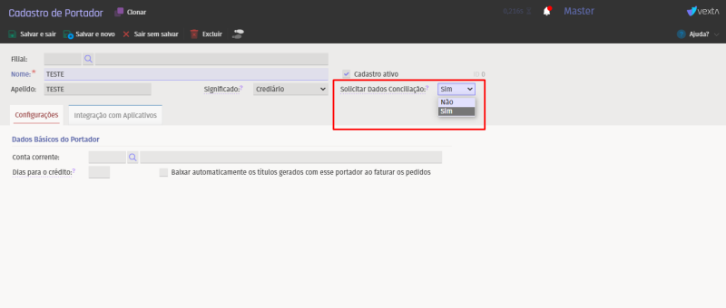 Caso o portador esteja com o Solicitar Dados Conciliação configurado como Não, os campos não serão exibidos.