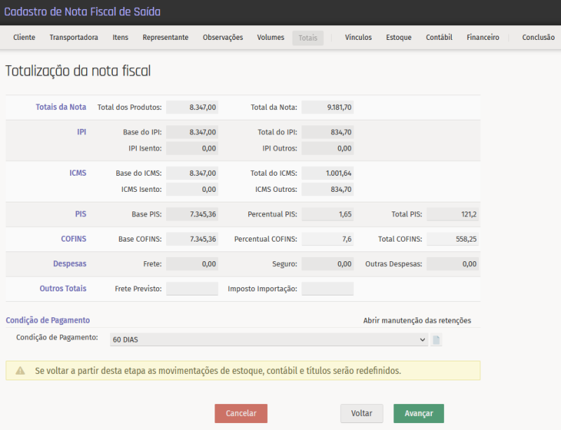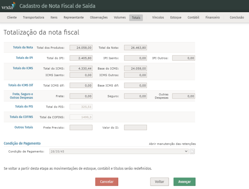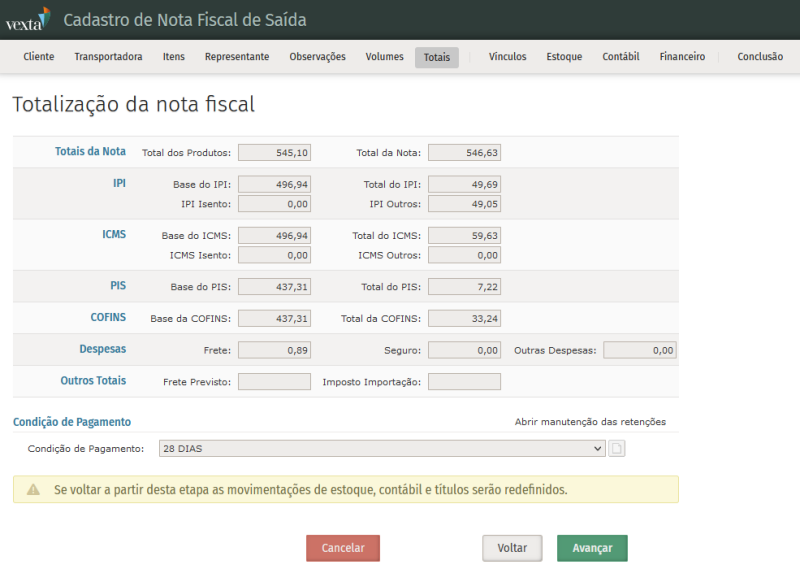 Aba Totais da Assistente de Nota Fiscal de Saída mudou: