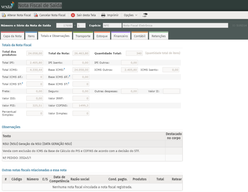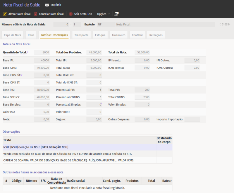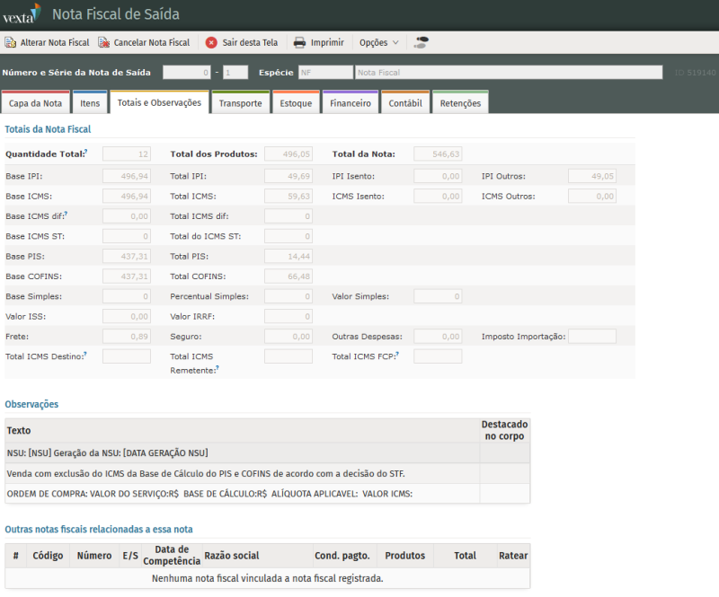 Aba Totais e Observações da tela de Consulta de Nota Fiscal de Saída mudou: