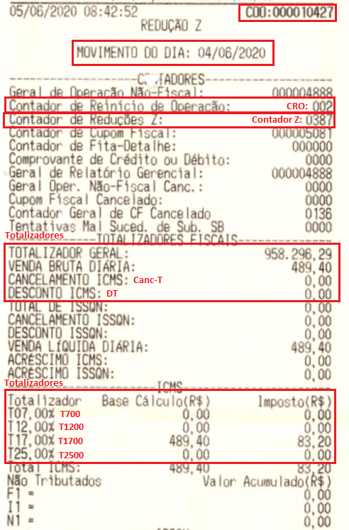 Abaixo é possível ver parte de um extrato de uma redução z impresso. As áreas destacadas em vermelho são informações relevantes que precisam estarem cadastradas no ERP.