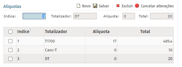No caso específico não existiu cancelamento ou desconto nos cupons faturados no dia do exemplo acima. Mas caso este fosse o cenário, havendo R$10 e R$20, sendo cancelamento e desconto respectivamente os totalizadores/alíquotas estariam cadastradas da seguinte maneira: