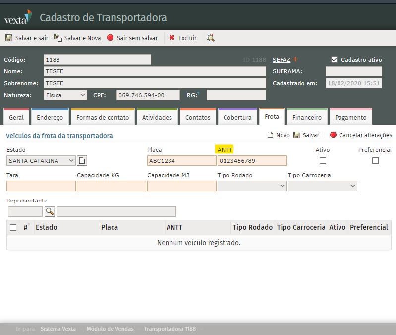 Esta informação é adicionada no Cadastro do Transportador, na aba Frotas.