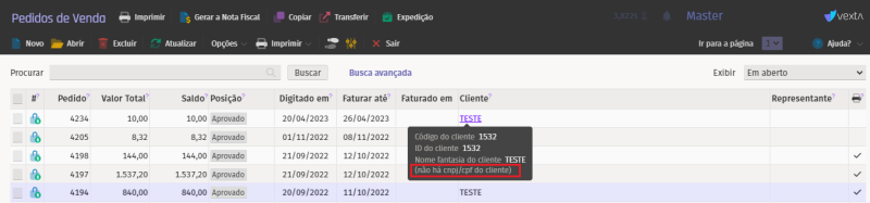Ao passar o mouse sobre o Cliente, nas Telas: Pedidos de Venda, Venda Simplificada, Liberação Comercial dos Pedidos e Liberação de Crédito dos Pedidos. É possível visualizar o campo CNPJ/CPF do cliente, que contém, caso preenchido, o CPF ou CNPJ do cliente.