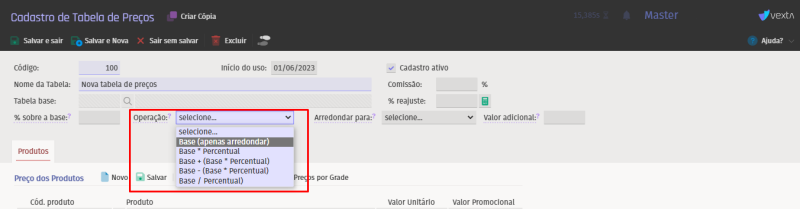Alterada a forma de fazer o cálculo da tabela de preços, quando informada uma tabela base. O usuário poderá escolher na tela de cadastro, qual a operação que deseja realizar ao informar o % sobre a base.