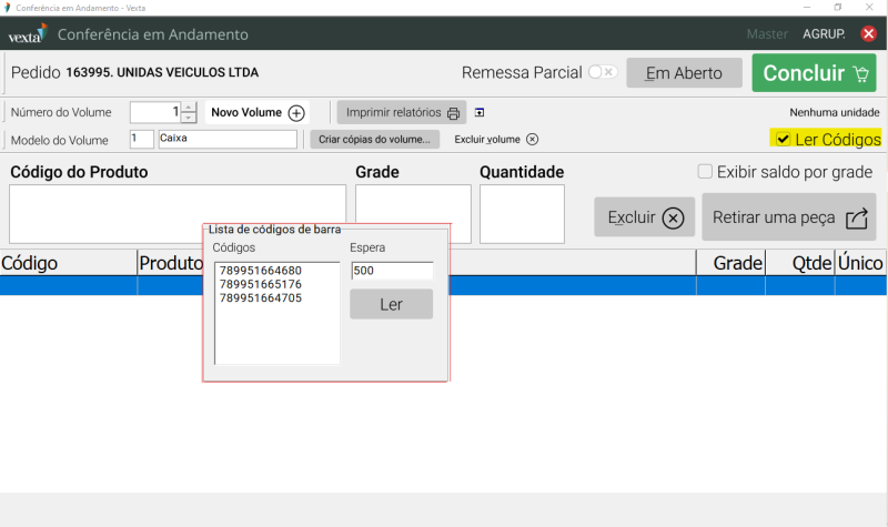 Nesta tela retratada em vermelho acima, é possivel colocar todos os códigos de barras dispostos no pedido de venda, e os ler de uma só vez, clicando em LER.