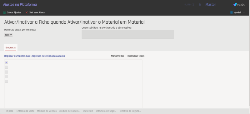 Caso o usuário selecione "SIM", fichas técnicas e fichas de custos serão ativadas/inativadas automáticamante quando o material for ativadas/inativadas .