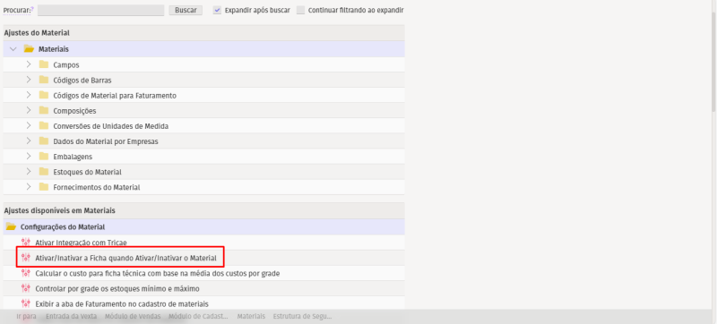 Quando ativar/inativar um material-pai, todos os materiais-filhos serão ativados/desativados.