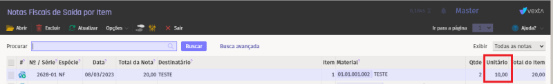 Os registros serão apresentados dessa forma, exibindo a coluna "UNITÁRIO".