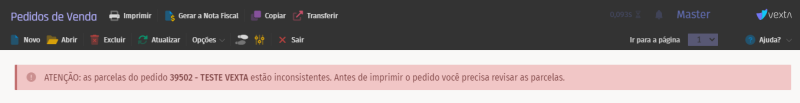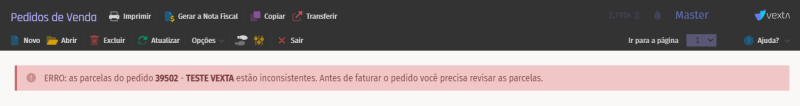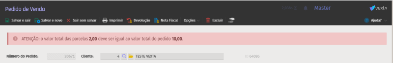 Caso a diretiva esteja marcada com: "SIM", o Vexta ERP não permitirá salvar o pedido de venda, com o valor total das parcelas inconsistente com o valor total do pedido. Retornando um erro, para que as parcelas sejam ajustadas.