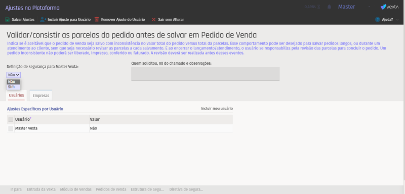 Caso a diretiva esteja marcada com: "NÃO", o Vexta ERP permitirá salvar o pedido de venda, com o valor total das parcelas inconsistente com o valor total do pedido.