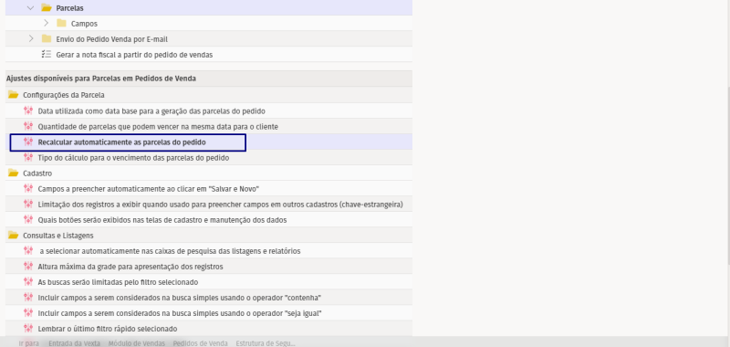 É importante lembrar que a diretiva será usada por clientes que optam por não recalcular o pedido de venda. Os ajustes dessa diretiva podem ser acessados em: Pedido de Venda>> Diretivas>> Parcelas>> Recalcular automaticamente as parcelas do pedido