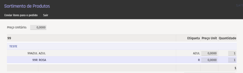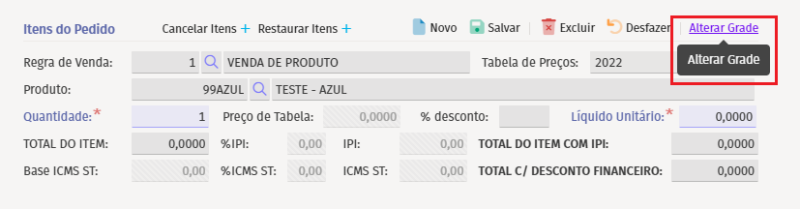 Dessa forma, esses itens vão aparecer no Sortimento de Produtos ao alterar a grade do item no Pedido de Venda.