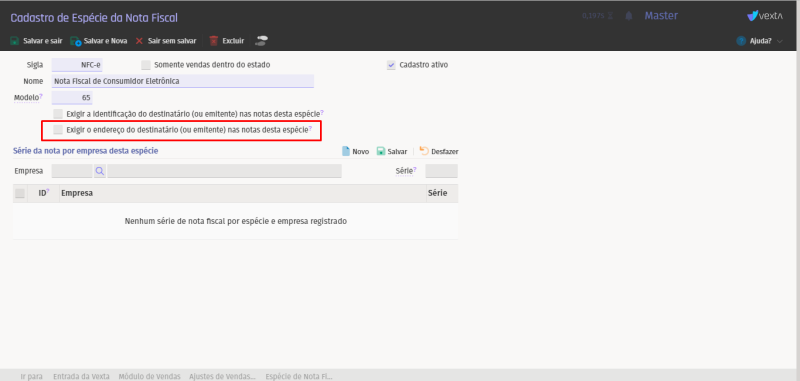 No módulo de vendas, acesse as configurações de venda e faturamento. Em seguida, localize a opção "Espécies de notas fiscais". Dentro dessa seção, procure pela espécie que deseja alterar e clique para abrir suas configurações. Dentro do Cadastro de Espécie da Nota Fiscal, procure pela flag "Exigir o endereço do destinatário (ou emitente) nas notas desta espécie".