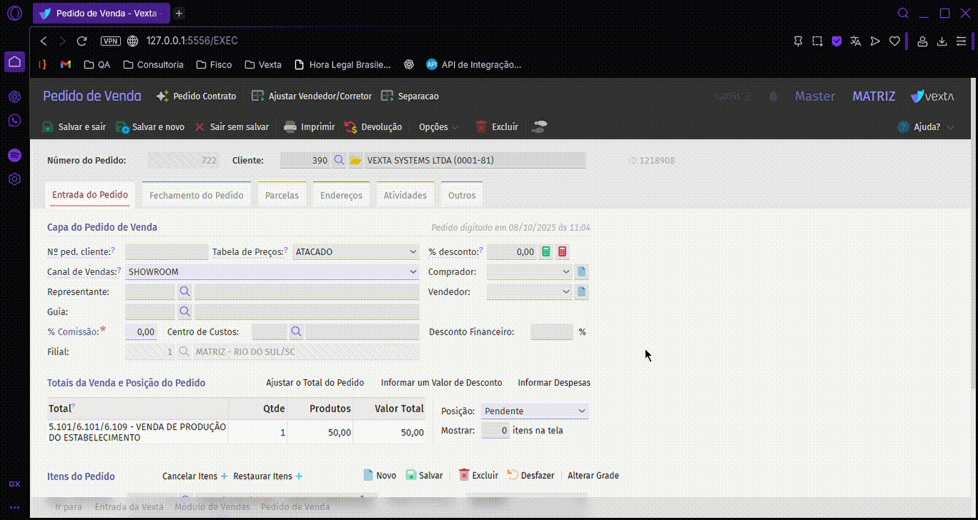 Na tela de cadastro do pedido de venda: