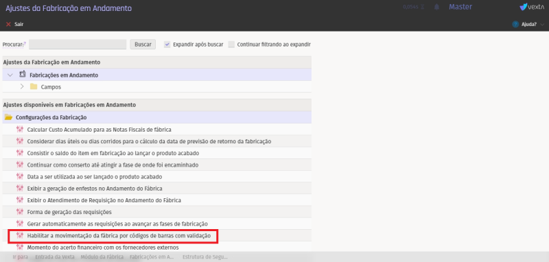 Para que isso seja possível, é necessário que a diretiva, "Habilitar a movimentação da fábrica por códigos de barras com validação" esteja marcada como "SIM".