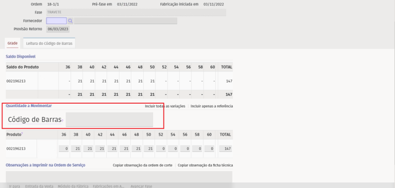 Com a diretiva configurada, é exibido o campo "Código de Barras" nas movimentações da fábrica e valida o saldo ao bipar.