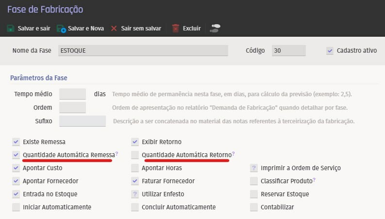 Ao abrir um registro, as flags "Quantidade Automática Remessa" e "Quantidade Automática Retorno" podem ser marcadas ou não. Se não marcadas, o sistema não irá carregar automaticamente as quantidades nas remessas ou retorno da fase.