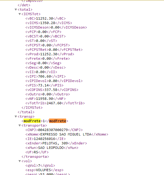 Importação de NF‑e - tag modFrete