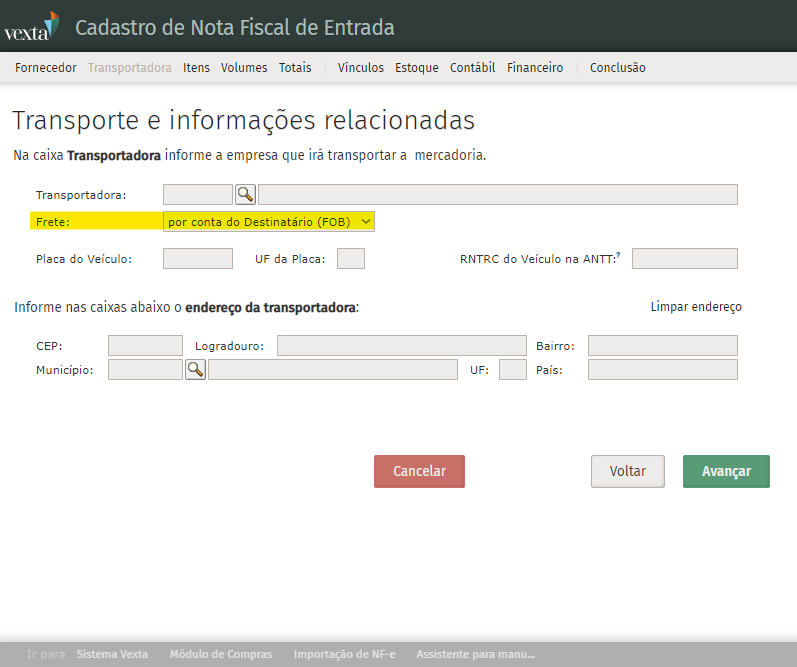 Se for 1 - Dest. (FOB) na tela fica a imformação por conta do Destinatário (FOB);