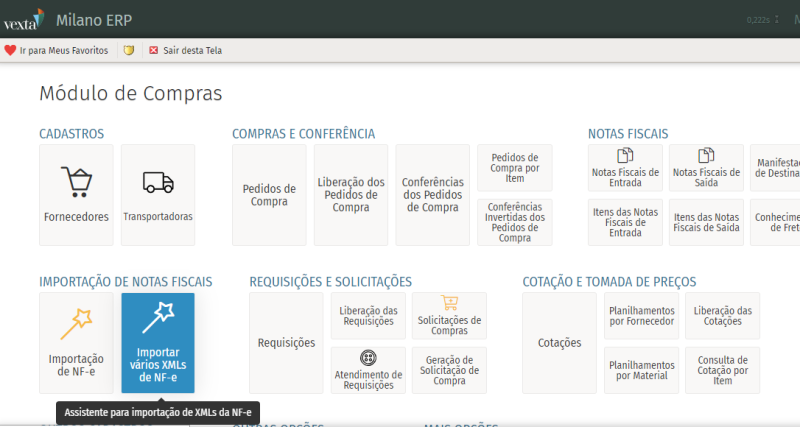 A opção Importar vários XMLs de NF‑e, onde se pode importar mais de uma nota, pelo seu xml, de uma só vez.