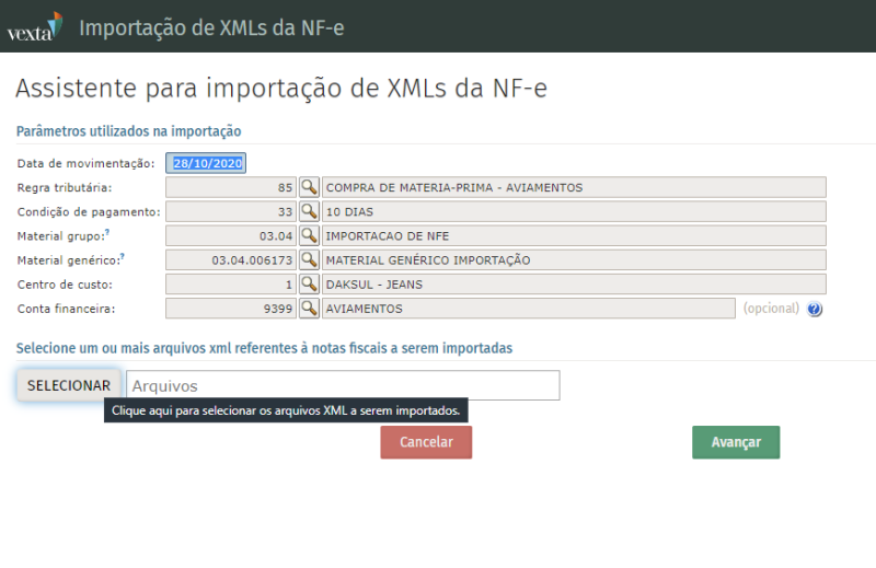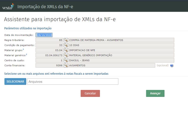 Configurando os campos da tela, acima relatados, ao abrir a tela de importação, ela vem com dados preenchidos.