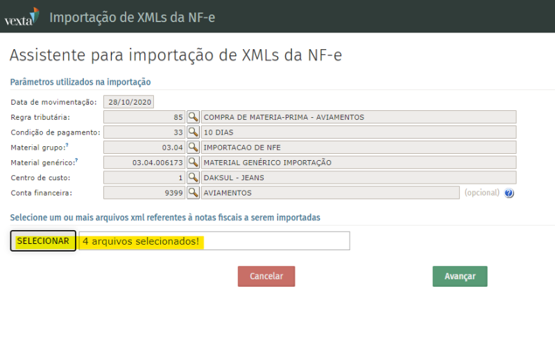 Ao clicar em SELECIONAR, é possível selecionar quantos xmls desejar importar de uma só vez. Lembrando que quantos mais xmls, mas tempo a rotina levará para processar os dados.