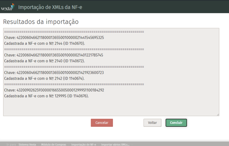 Ao clicar em Avançar, o sistema vai importar as notas, as cadastrar no sistema, e gerar uma tela com os resultados do processo:
