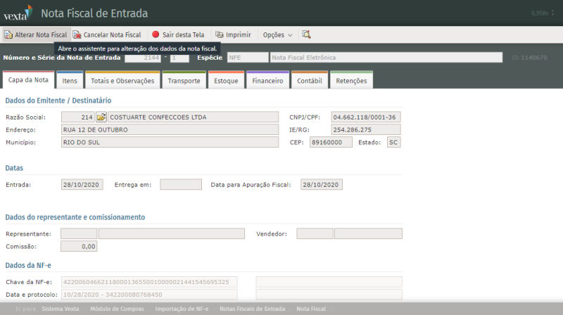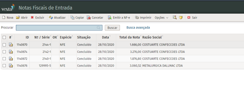Ao clicar em Concluir, abrirá a tela de Notas Fiscais de Entrada, com a listagem de todas as notas importadas: