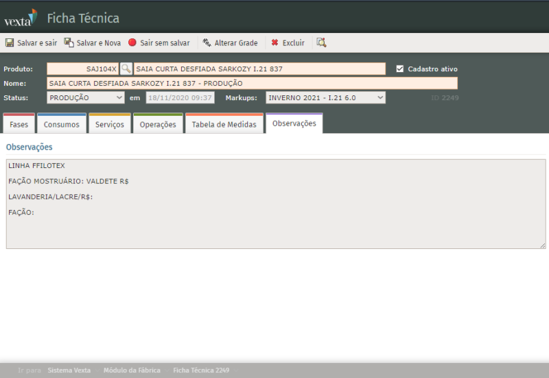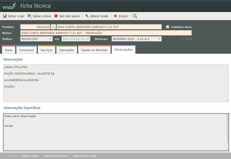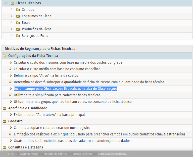 Módulo Fábrica > Fichas Técnicas > Diretivas > Configurações da Ficha Técnica > Incluir campo para Observações Específicas na aba de Observações
