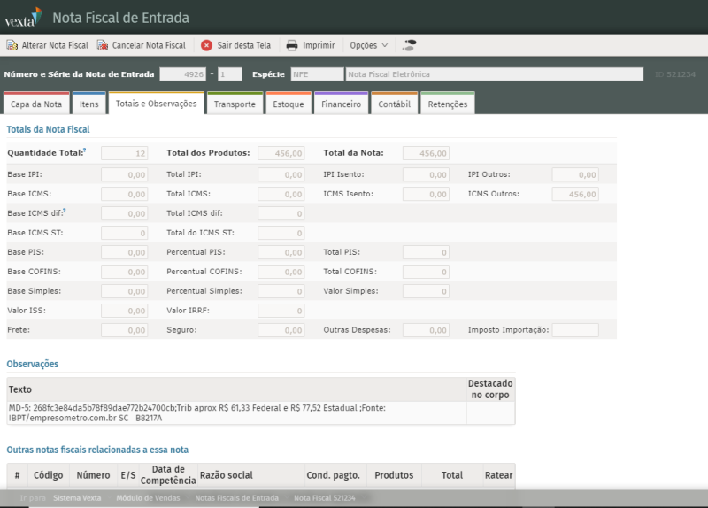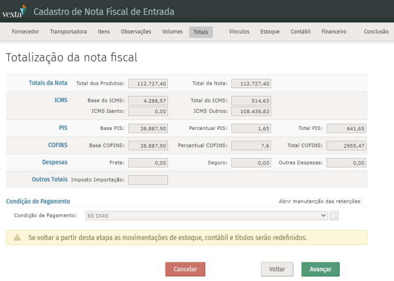 Com o objetivo de demonstrar de forma clara, a cada movimentação no ERP Vexta os valores referentes aos impostos. E para facilitar a conferência destes, incluímos nas telas de nota fiscal a base e valor de PIS e Cofins.