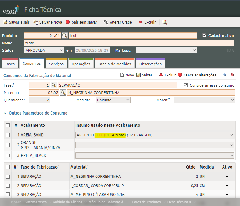 Ao vincular esta nos consumos específicos da Ficha Técnica, este campos seja desconsiderado.