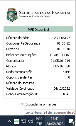 - Abrindo os serviços do Windows, deve haver um serviço chamado "Comunicador" e este tem que estar iniciado, na Barra de Tarefas também será apresentado um ícone "Monitor MFe" que deve mostrar o status como disponível, conforme segue: