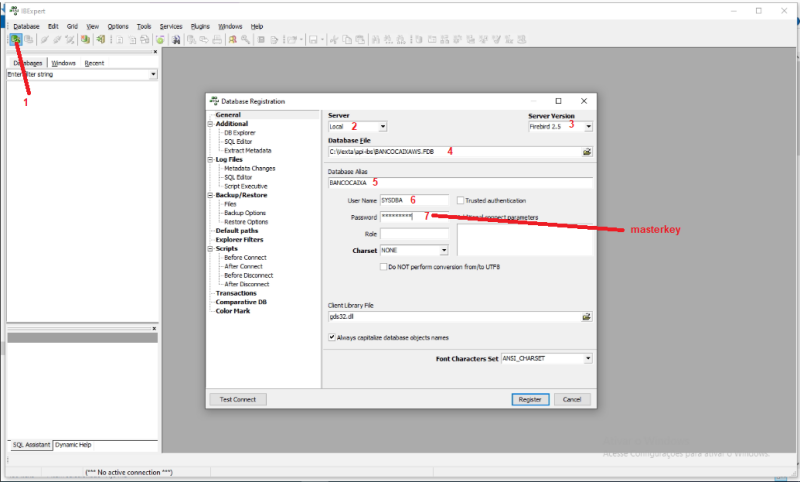 - Após, abra o IBExpert e terá o seguinte questionamento "Do you prefer Single Document Interface (SDI)?", deve se informar "No", depois seguir os passos demarcados na imagem a seguir: