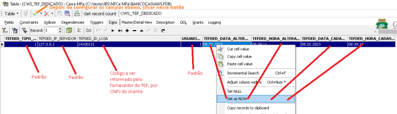 - Clique em "+" ao lado de Tables, desça até localizar CWS_TEF_DEDICADO, dê dois cliques na mesma, e depois clique em "data", em seguida preencha os dados conforme imagem abaixo: