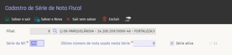 - Após este cadastro, na entidade "NFSerie" deve ser cadastrada uma nova série para a emissão de CF-e, conforme modelo abaixo: