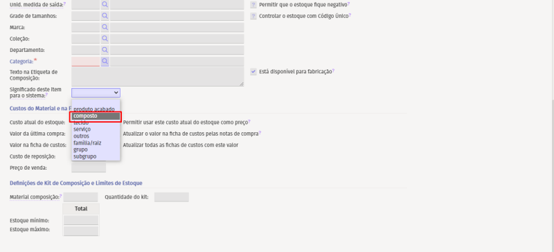 Para transformar um material existente em composto, basta selecionar o tipo "Composto" na combo "Significado deste item para o sistema", no cadastro de materiais.