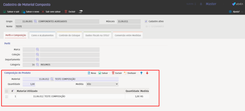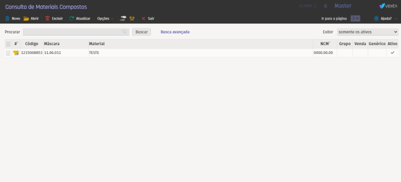 Ao alterar o "Significado deste item para o sistema" para "Composto", o material deverá listado na consulta de Materiais Compostos.