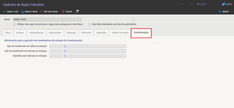 No cadastro da regra, foi adicionada a aba Transformação, com os campos: Tipo de movimento de saída do estoque, Tipo de movimento de entrada no estoque e Depósito para entrada no estoque.