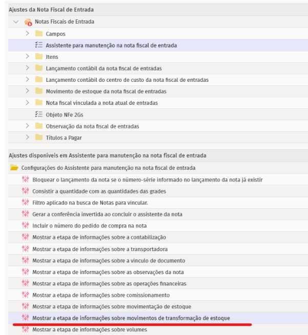 Caso a diretiva "Mostrar a etapa de informações sobre movimentos de transformação de estoque" esteja marcada como "Sim" para o "Assistente para manutenção na nota fiscal de entrada" e os campos da aba transformação, estejam preenchidos no cadastro da regra.