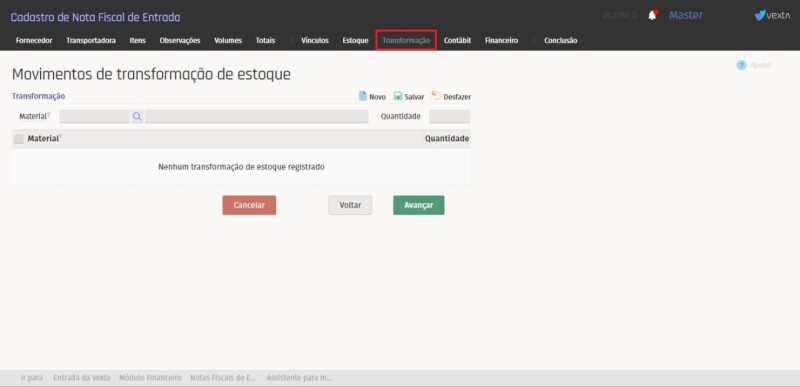 No assistente da Nota Fiscal de Entrada será exibida a aba "Transformação".