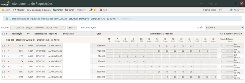 Dessa forma, adicionamos uma melhoria na tela de atendimento de requisições no fábrica, possibilitando ao usuário requisitar/atender os insumos por grade.