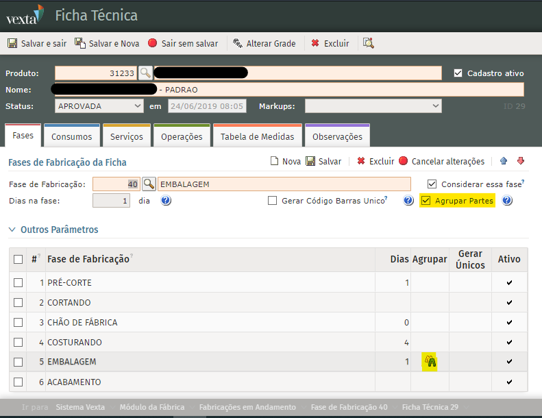E no cadastro da Ficha Técnica, configurado a fase para Agrupar Partes, conforme abaixo:
