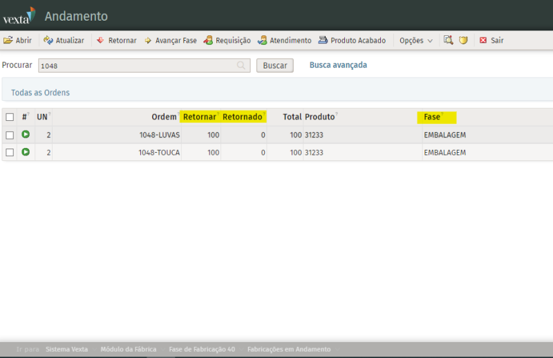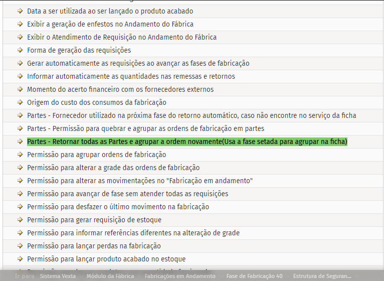 Na tela de Fabricação em Andamento é possível configurar a diretiva: Partes - Retornar todas as Partes e agrupar a ordem novamente(Usa a fase setada para agrupar na ficha)